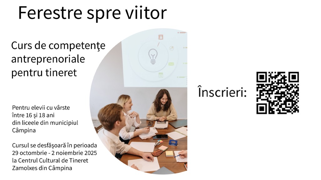 Fundația Zamolxes lansează un nou program de formare pentru tinerii din Câmpina, sub titlul „Ferestre spre viitor – curs de competențe antreprenoriale pentru tineret”, desfășurat în perioada 29 octombrie – 2 noiembrie 2025. Proiectul, finanțat de Consiliul Județean Prahova, își propune să încurajeze inițiativa, creativitatea și spiritul civic al elevilor de liceu cu vârste între 16 și 18 ani.