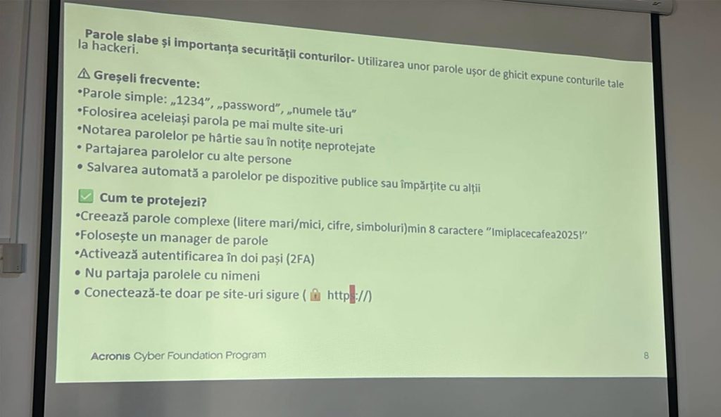 Organizatorii au subliniat importanța educației digitale și a vigilenței în fața fraudelor online. Participanții au fost îndrumați să recunoască principalele riscuri – înșelătoriile telefonice, e-mailurile false și capcanele de pe rețelele sociale – și au învățat câteva reguli simple care pot preveni atacurile cibernetice: utilizarea parolelor puternice și a autentificării în doi pași; verificarea autenticității site-urilor („https://” și simbolul lacătului); evitarea linkurilor și mesajelor suspecte care cer date personale.