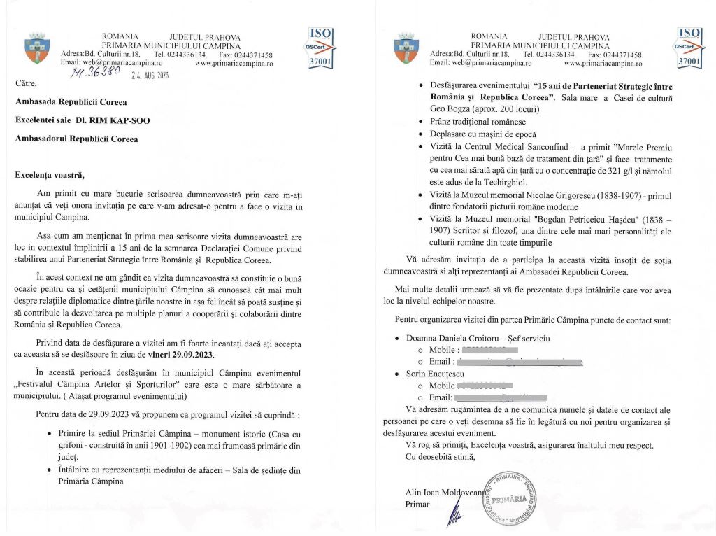 Potrivit scrisorii de intenție semnată de primarul Câmpinei, invitația adresată oficialilor coreeni „are loc în contextul împlinirii a 15 ani de la semnarea Declarației Comune privind stabilirea unui parteneriat strategic între România și Republica Coreea”.