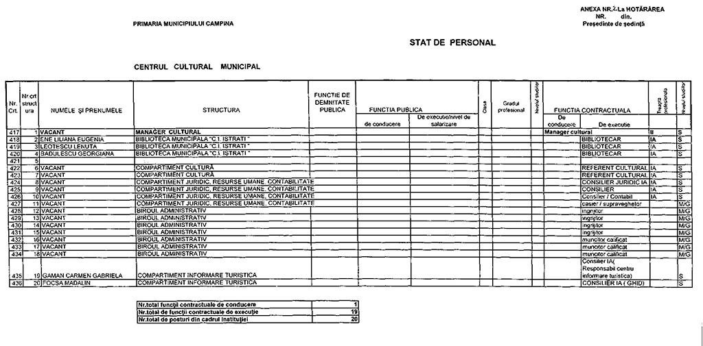 Doresc sa adresez urmatoarea intrebare: de ce doamnele de la Biblioteca si domnii de la Centru de informare turistica si-au pastrat posturile si celelalte sunt scoase la concurs? Sa intelegem ca se triaza pilele: cei care inca au pile raman, ceilalti pleaca sau isi gasesc alte pile sa poata ramane si ei? Au timp toti pana se aproba proiectul! Alta intrebare: nu-s cam multe posturi la administrativ contabilitate ca nu prea mai inteleg cum o sa se faca cultura? Proiectul asta pare alta treaba facuta asa ca sa nu zicem ca n-a fost facuta sau ca sa se schimbe niste pile cu altele. Rog sa nu cenzurati comentariul!