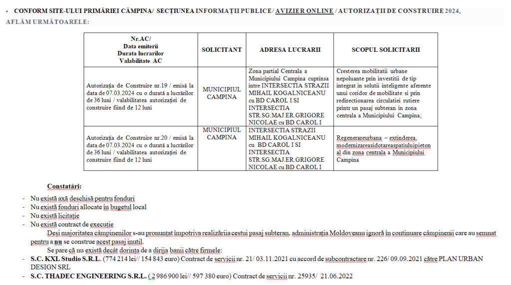 ”Atenție! Primarul Moldoveanu a eliberat autorizațiile de construire pentru pasajul subteran din centrul Câmpinei
