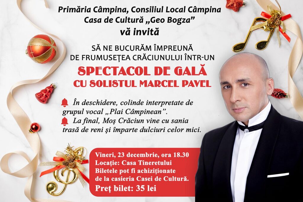 Miercuri, 23 decembrie, Casa de Cultura „Geo Bogza” vă invită la un spectacol de gală cu un solist de calibru, nimeni altul decât artistul Marcel Pavel, ale cărui calități vocale de excepție, precum și stilul muzical abordat, vor face ca acest concert să fie unul de neratat. La final, Moșul cel bun va ajunge pe scenă pentru a-i bucura pe micuții prezenți.