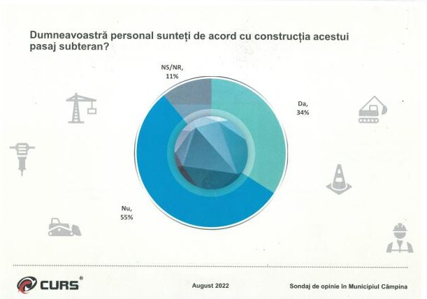 Dorim totodată să vă informăm că la inițiativa noastră, Centrul de Sociologie Urbană și Regională – CURS a fost realizat un sondaj de opinie în municipiu, al cărui rezultat îl atașăm prezentei, în urma căruia a reieșit că un procent de 55 % dintre câmpineni NU doresc realizarea unui pasaj subteran în centrul localității.