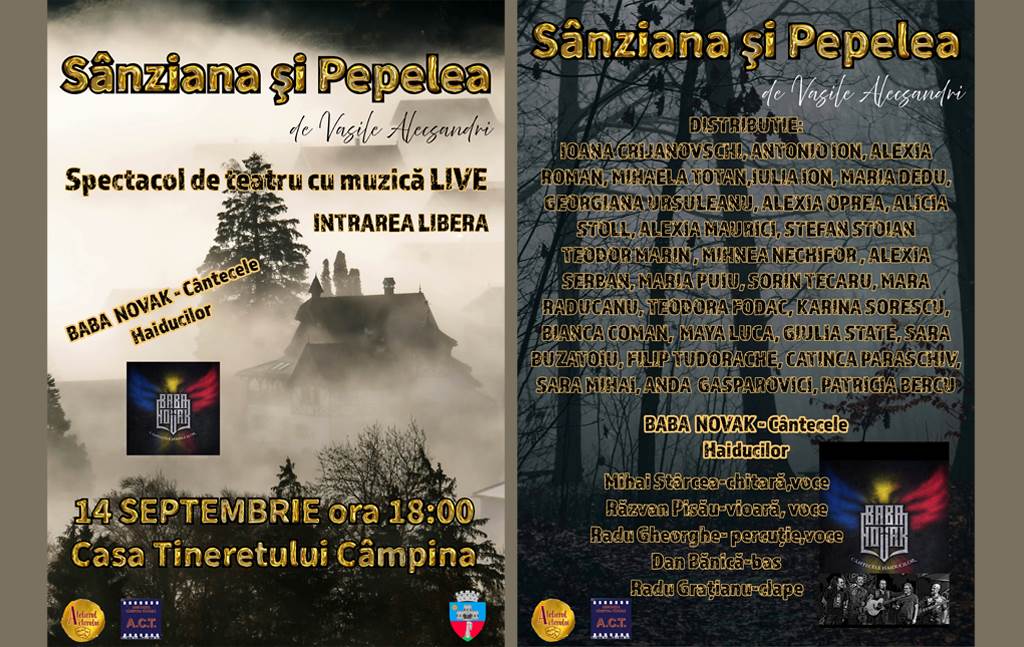Atelierul Actorului din Câmpina anunță debutul stagiunii cu premiera spectacolului „Sânziana și Pepelea” de Vasile Alecsandri, într-o reinterpretare modernă și captivantă a celebrei „feerii naționale”. Evenimentul va avea loc sâmbătă, 14 septembrie, începând cu ora 18.00, la Casa Tineretului. Intrarea este liberă!