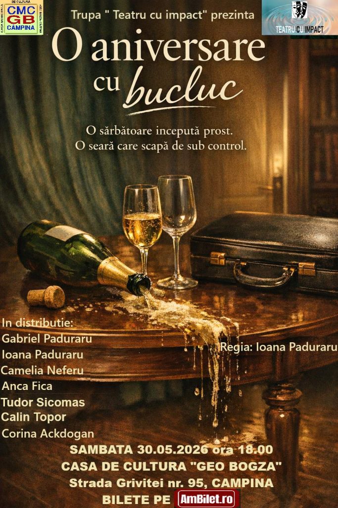 Pe final de primăvară, scena Casei de Cultură „Geo Bogza” își deschide porțile pentru o întâlnire cu umorul de calitate și ritmul alert al teatrului contemporan. Pe 30 mai, de la ora 18:00, compania Teatru cu Impact propune publicului spectacolul „O aniversare cu bucluc”, o comedie care promite să transforme o seară obișnuită într-un carusel de emoții, situații-limită și hohote de râs.
