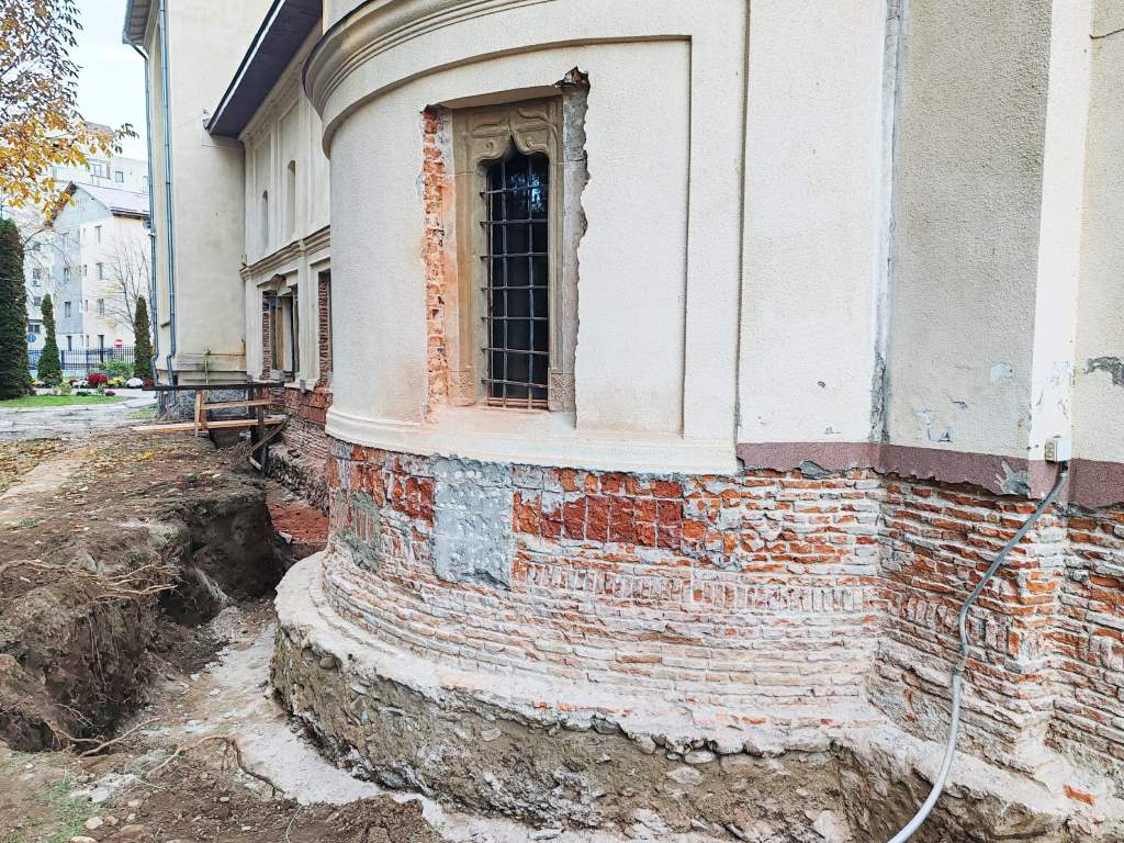 Zidul dezvelit în prezent ne arată și consolidarea făcută atunci în 1944 (proiectată de către marele arhitect modernist Ion Boceanu, cu o vastă operă în orașul nostru): la absidele altarului se distinge ușor zidul de cărămizi noi, puse atunci în zona ferestrei ce fusese deschisă la 1887, unde apăruseră la cutremur și puternice fisuri (foto 2).