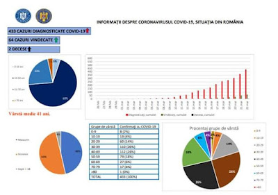 Până în acest moment, pe teritoriul României, au fost confirmate 433 de cazuri de persoane infectate cu virusul COVID – 19 (coronavirus). Dintre cele 433 de persoane confirmate pozitiv, 64 au fost declarate vindecate și externate (47 la Timișoara, 11 la București, 3 la Craiova, 2 la Constanța și 1 la Iași).