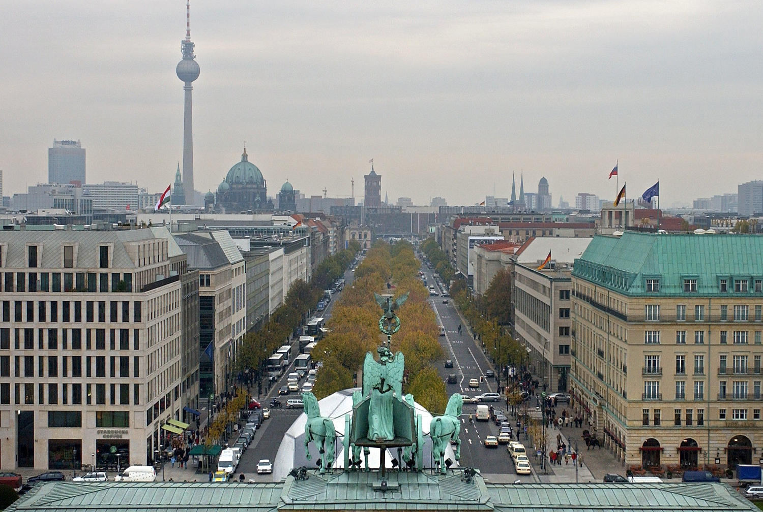 Mă întâlnesc cu grupul meu în Pariser Platz, în imediata apropiere a porţii Brandenburg. Suntem în partea ce odinioară a fost capitala RDG, de unde porneşte acest bulevard de tradiţie cunoscut în întreaga lume – Bulevardul Teilor. Piaţă este animată de oameni veseli cu feţe fericite şi de mulţi tineri gălăgioşi. În partea mea stângă este moderna clădire a Ambasadei Franţei, iar în dreapta Ambasada SUA, ce pare a se întrece în frumuseţe cu cea franceză. În spate am Poarta Brandenburg, refăcută şi strălucitoare, în timp ce în faţă se întinde acest bulevard larg, umbros, încărcat de istorie. Încerc să-mi imaginez cum arăta această zonă la sfârşitul celui de-al doilea război mondial: grămezi de ruine, fiare contorsionate, copaci calcinaţi din care au rămas doar cioturi, Poarta Brandenburg grav avariată, fără Quadriga Victoriei, nicio clădire rămasă în picioare, întrucât aici luptele s-au dat pentru fiecare stradă, pentru fiecare casă. Felul în care arată Berlinul astăzi, renăscut din propria cenuşă şi moloz, este un exemplu de hărnicie şi dorinţă de a şterge urmele trecutului.