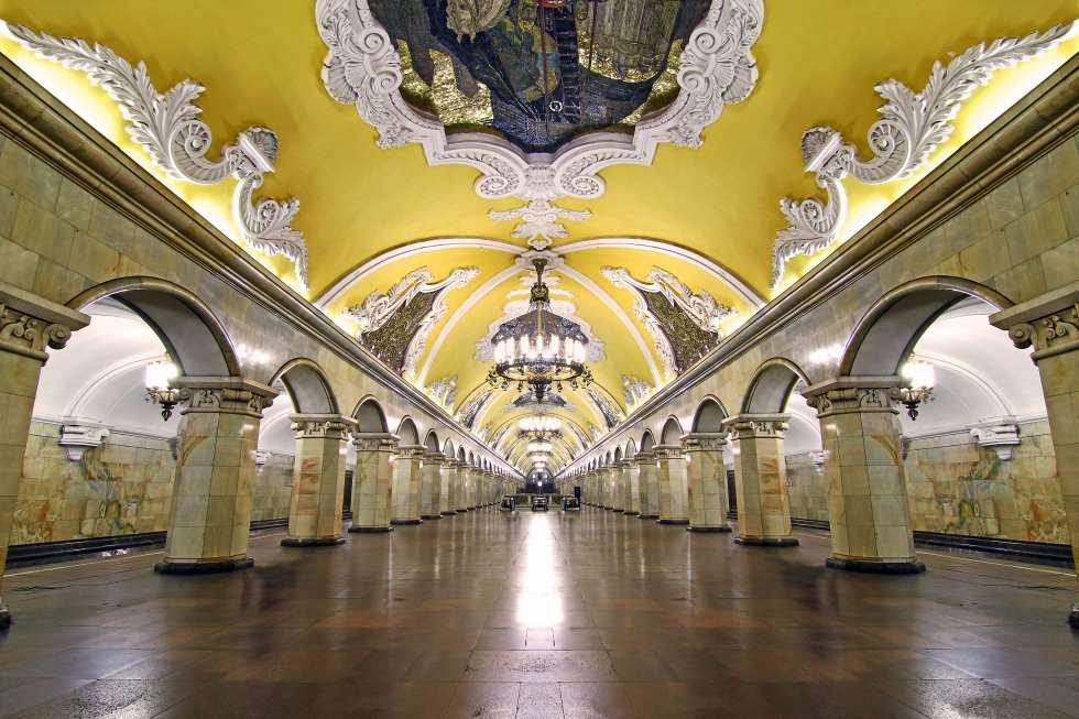 Două scări rulante mă poartă spre o mare adâncime, căci spre deosebire de metroul bucureştean sau din alte mari oraşe, care au liniile aproape de suprafaţă, acesta este unul de adâncime, care în timpul celui de-al doilea război mondial a fost folosit şi ca adăpost pentru populaţie. Scara rulantă mă lasă pe peronul staţiei Komsomolskaia, construită în 1935, unde odată ajuns am senzaţia că mă aflu mai degrabă într-un muzeu ori într-un palat: marmură în diferite culori, candelabre uriaşe, peroane străjuite de arcade din marmură şi o curăţenie impecabilă. Pentru că pot călători cu acelaşi bilet pe orice distanţă timp de 24 de ore (metroul mergând până la ora 1 dimineaţa), profit pentru a vedea şi alte staţii, precum „Novoslobodskaia” (1952), cu uimitoarele sale vitralii, apoi „Maiacovskaia” (1938) cu aceiaşi pereţi din marmură prezenţi în majoritatea staţiilor, dar cu tavanul decorat în mozaicuri multicolore şi mă opresc în staţia „Piaţa Revoluţiei” („Ploschad Revoliuţi” – 1938), pentru a admira cele 76 de statui din bronz reprezentând „creatorii noii lumi socialiste”, aşa cum sunt descrise într-un ghid al metroului.