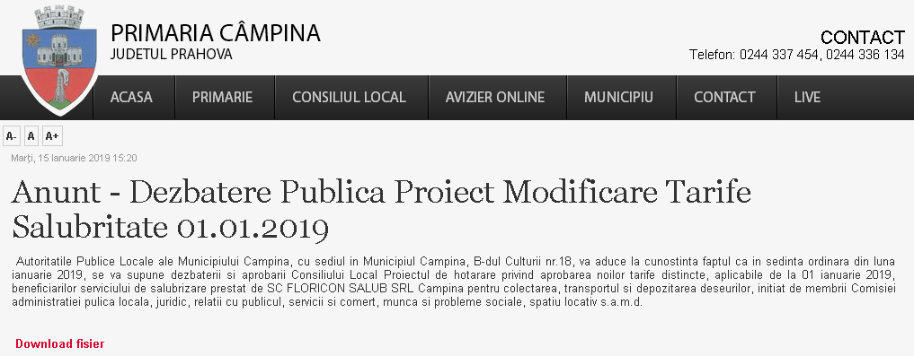 Administraţia publică locală – Comisia de administraţie publică a Consiliului Local propune un nou proiect de hotărâre cu privire la modificarea tarifelor pentru serviciul de salubrizare efectuat pe raza municipiului Câmpina de societatea Floricon Salub. Proiectul a intrat deja în dezbatere publică pe site-ul primăriei (www.primariacampina.ro) şi va fi supus aprobării în Consiliul Local în şedinţa care va avea loc în data de 31 ianuarie. Cetăţenii interesaţi de acest nou plan tarifar pot depune în scris propuneri (prin poştă, prin e-mail sau direct la Registratura primăriei) până la data de 25 ianuarie.