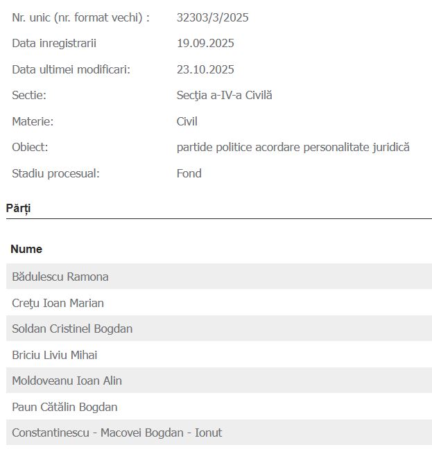 Dosarul, aflat pe rolul Tribunalului București, are primul termen de judecată programat pentru 6 noiembrie 2025. În cazul în care instanța va admite cererea, noul partid politic va dobândi personalitate juridică, marcând oficial debutul unei noi formațiuni în peisajul politic prahovean și național.