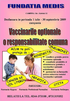 Fundaţia Medis a demarat o amplă campanie de vaccinare opţională, începând cu data de 1 iulie. Din partea Fundaţiei Medis, de această campanie se ocupă medicii Minerva Stanciu, Mihaela Sumbasacu, Anca Pop şi Cristina Radu.Vaccinurile opţionale ne protejează într-o mare măsură în faţa afecţiunilor grave, printre care meningită, septicemie, otită, pneumonie, varicelă, zona Zoster, cancer de col uterin sau hepatită. Activităţile de campanie au în vedere consilierea gratuită asupra vaccinurilor opţionale, un consult general prealabil şi administrarea gratuită a vaccinurilor opţionale, mese rotunde şi alte facilităţi. Ei bine, vineri, după prânz, la restaurantul “Muntenia” a avut loc o astfel de masă rotundă, la care au participat medici (în general, medici de familie), farmacişti, alte cadre de specialitate.S-a vorbit despre importanţa vaccinărilor opţionale, despre cauze, efecte, despre situaţii statistice, iar reprezentanţii firmei Sanofi Pasteur, partener al Fundaţiei Medis în cadrul acestei campanii, şi-a prezentat produsele.Campania se va derula până la 30 septembrie, urmând a mai fi desfăşurate şi alte activtăţi de informare a populaţiei în privinţa acestor vaccinuri opţionale.
