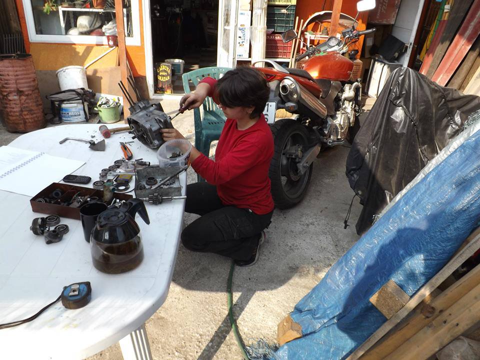 – Asta este o chestie la care mă gândesc intens de o vreme încoace! De unde a început toată nebunia şi cred că e un cumul de mai multe evenimente. Unul dintre ele este şi copilăria mea. Mi-a plăcut dintotdeauna să prepar şi să repar. Adică, dacă se spărgea o ţiglă pe casă, eram acolo să o schimb, dacă trebuia vopsit gardul, eram plină de vopsea din cap până în picioare… La 15 ani am început să dau meditaţii ca să strâng bani să îmi iau permisul de motocicletă. De unde a pornit chestia asta, iarăşi nu ştiu! Îmi aduc aminte că primul cuvânt pe care am învăţat să-l scriu a fost “motocicletă”. Nu ştiu de unde şi cum! Fiecare copil visează la ceva, eu visam motociclete. Deci, ceva probabil m-a marcat şi imediat cum am prins momentul am zis “Gata! Îmi iau motocicletă!”. Şi nu pot uita cuvintele tatei care mi-a zis: “Îţi iei motocicletă, te decojesc ca pe o banană!”. Şi, bineînţeles, a trebuit să dau meditaţii ca să strâng banii necesari pentru a-mi îndeplini visul. Şi acesta cred că a fost pasul cel mare, pentru că eram cam singură, nu cunoşteam pe nimeni cu motocicletă şi dacă se strica ceva la a mea, n-aveam la cine să apelez. Am fost nevoită să învăţ singură mecanică. Am demontat-o, am scos fiecare piesă, i-am desenat conturul pe hârtie, am aranjat-o, am montat-o la loc, n-a pornit, iar am desfăcut-o, iar am făcut-o, până la urmă am reuşit. Mi-a luat ceva săptămâni, însă efortul nu a fost în zadar.