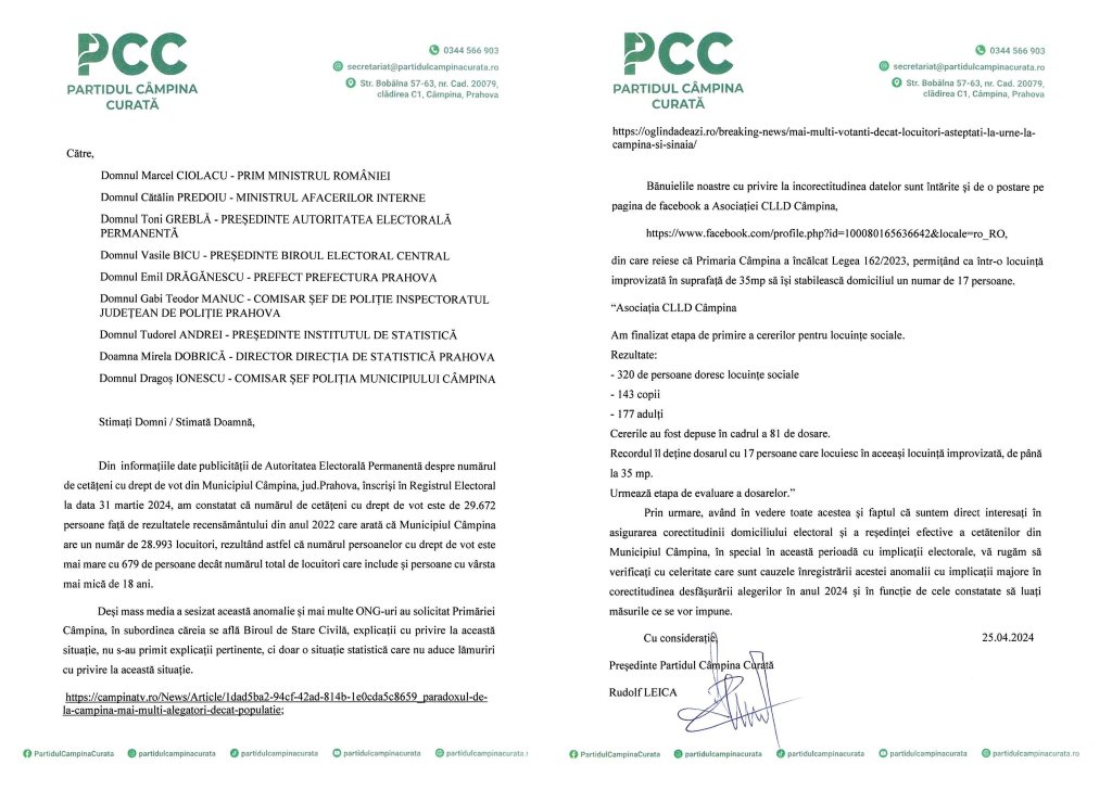 Un alt subiect foarte important pe care dorim să îl aducem în atenția câmpinenilor și pe care o parte a presei locale l-a semnalat ( https://oglindadeazi.ro/breaking-news/mai-multi-votanti-decat-locuitori-asteptati-la-urne-la-campina-si-sinaia/ ) este faptul inexplicabil prin care la Câmpina numărul de cetațeni cu drept de vot este mai mare decat numărul total de locuitori. Mai precis, Autoritatea Electorala Permanentă (AEP) stabilește că la Câmpina, la data de 9 iunie, pot vota 29.666 de alegători, iar Institutul National de Statistică (INS), în baza recesământului din 2021, raportează că Municipiul Câmpina are un total de 28.993 de locuitori. Aceeași anomalie o întâlnim și la Sinaia. Acest fapt atrage suspiciuni referitoare la posibile fraude electorale și de aceea, Partidul Câmpina Curata a întocmit și transmis un memoriu tuturor autoritaților statului român care au competență în această speță.