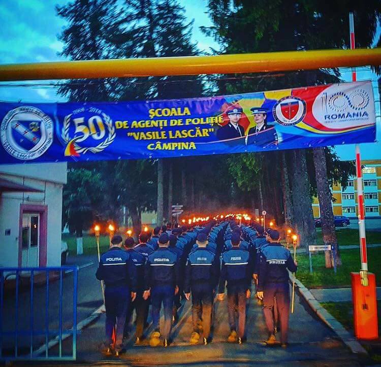 Anul acesta, Şcoala de Agenţi de Poliţie „Vasile Lascăr”, una dintre instituţiile emblematice ale Câmpinei, a împlinit 50 de ani de la înfiinţare. Pentru marele jubileu, conducerea unităţii s-a pregătit foarte bine şi a organizat, în zilele de 10 şi 11 mai, festivităţi omagiale de mare amploare. Cu această ocazie, pe 11 mai, au avut loc manifestări la care au participat delegaţii de la câteva şcoli de poliție din Europa (aflate în relaţii de colaborare cu școala polițienească din Câmpina), dar şi de la toate unităţile de învăţământ din cadrul Ministerului Afacerilor Interne din România. În aceeaşi zi, în jurul orei 11.00, pe platoul central al unităţii, s-a desfăşurat un ceremonial la care au participat numeroşi invitaţi: oficialităţi importante din Ministerul Afacerilor Interne, foste cadre de conducere ale unităţii, ofiţeri de poliţie ai unor școli din patru state europene, cu care şcoala din Câmpina are relaţii de cooperare. Cu o zi mai devreme, pe Bulevardul Carol I din municipiul nostru, avusese loc manifestarea denumită “Retragerea cu torţe”, în cadrul căreia, pe traseul Casa Tineretului – Şcoala de Poliţie, aproape 1300 de elevi dispuşi pe mai multe coloane, au defilat grupaţi în detaşamente conduse de ofiţeri instructori, o parte dintre elevi purtând în mâini torţe aprinse care au dat un farmec în plus ceremonialului urmărit cu interes, de pe ambele trotuare, de numeroşi câmpineni.