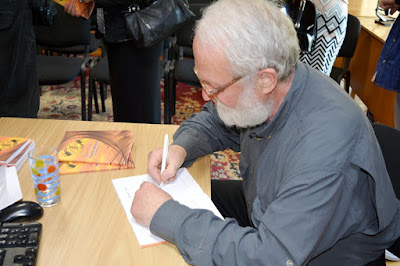 | Ștefan Al. Sașa ținând în mâină o carte cu parodii după mari poeți consacrați care i-a adus marele premiu la Festivalul de la Vaslui |